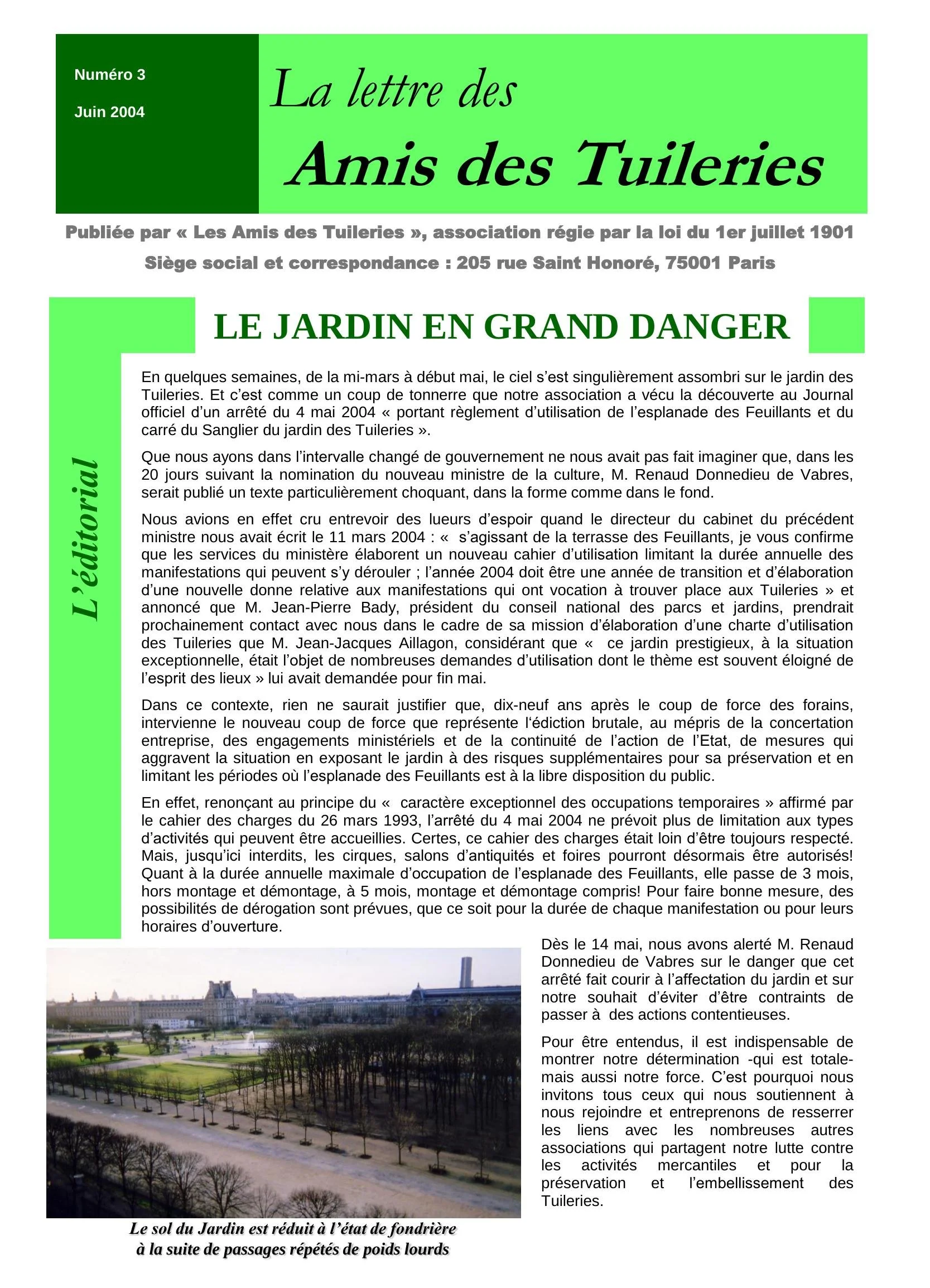 L’Association Les Amis des Tuileries, a publié régulièrement des bulletins, le premier datant de 2003. Ces bulletins regorgent d’informations sur les activités de l’association ainsi que sur les enjeux liés à l’utilisation commerciale du jardin des Tuileries. Vous pouvez les retrouver ci-dessous : il vous suffit de cliquer sur l’image pour les télécharger en PDF et les lire.